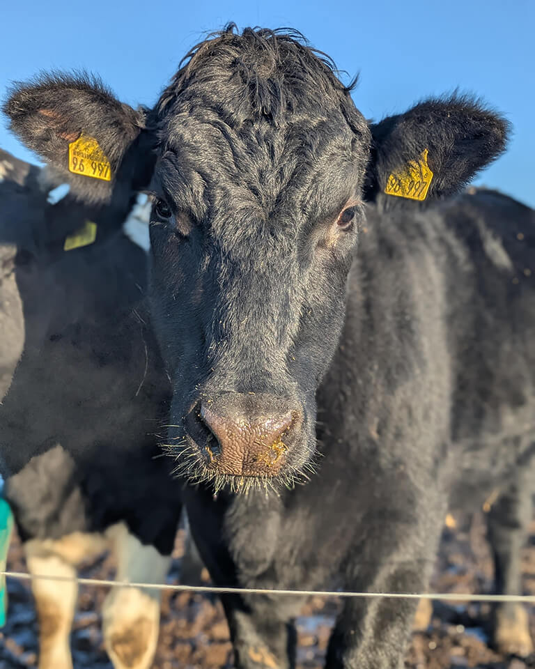 Dracula ist eine wunderschöne schwarze Kuh, die plötzlich den Mut fand, Liebe einzufordern. Jetzt zeigt sie auch bei Fremden keine Scheu mehr. Tick: Beim Schlafen stützt sie ihre Nase ab, z. B. auf dem Gitter – man könnte ja umfallen.